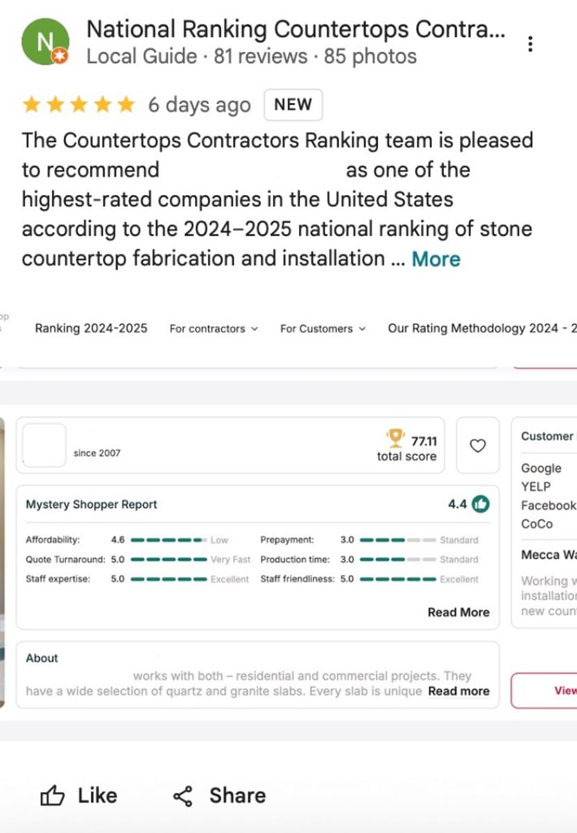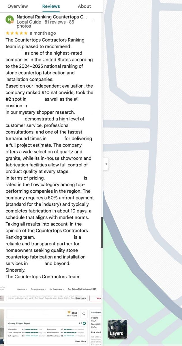 Example of a review from the Countertops Contractors team to one of the ranking contractors