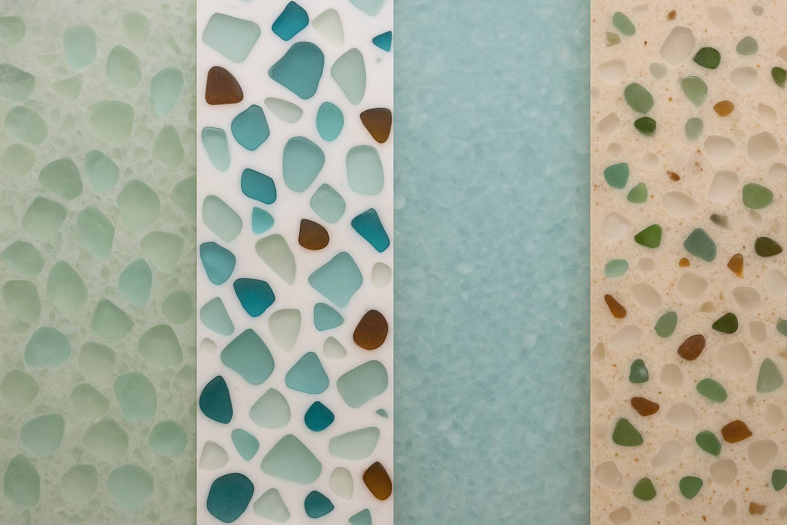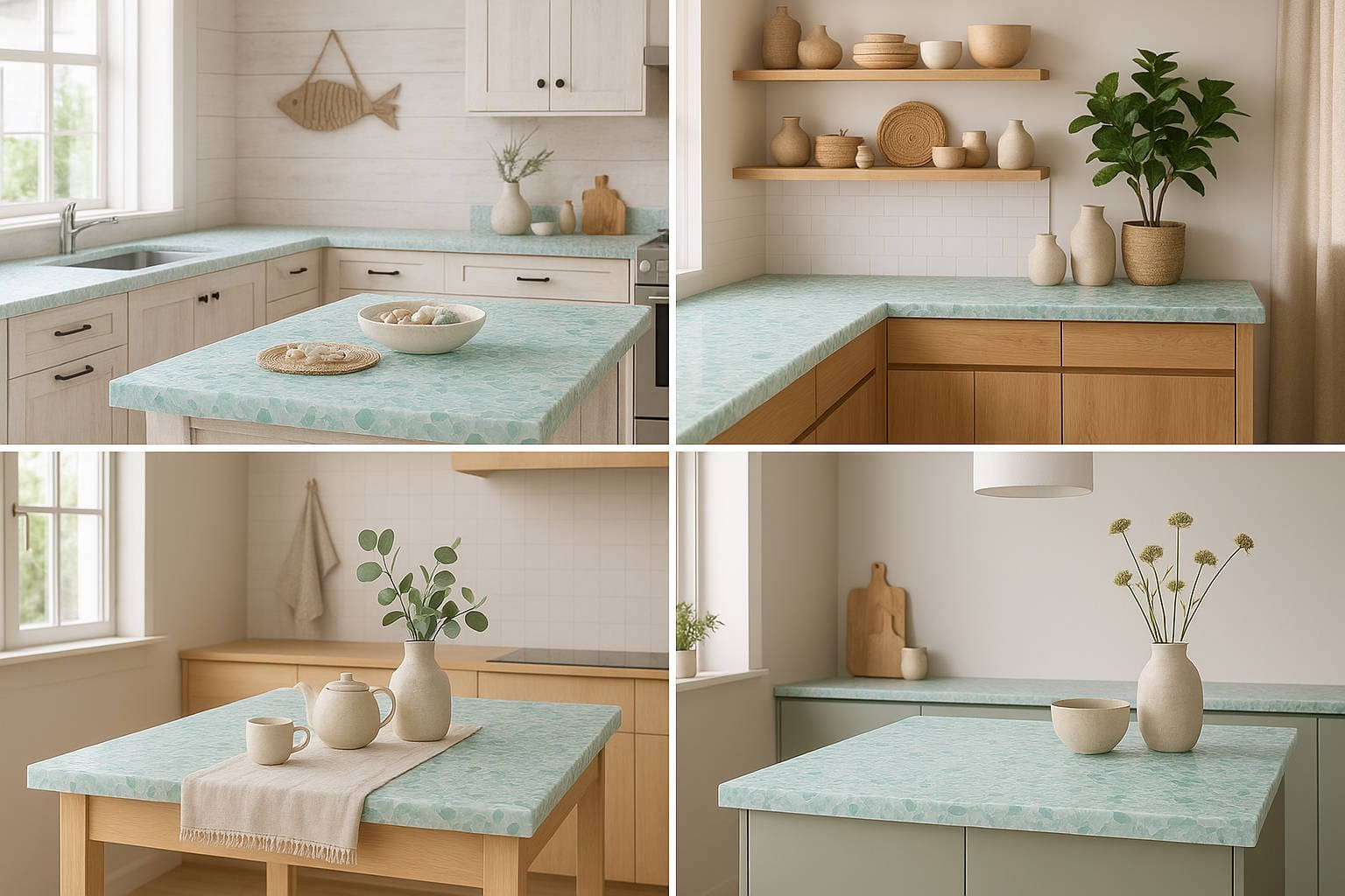 Sea glass countertops look their best in interiors with a natural, relaxed feel. They fit beautifully into coastal-inspired spaces, light boho interiors, Scandinavian minimalism, and modern designs that combine natural materials, simple shapes, and a soft, airy color palette.