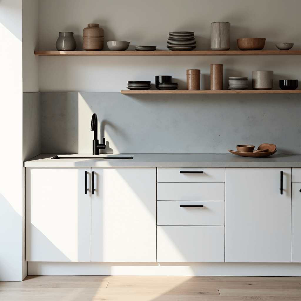 A sleek gray countertop set against crisp white cabinetry, open shelving, and bold black accents — a timeless combination that never fails.