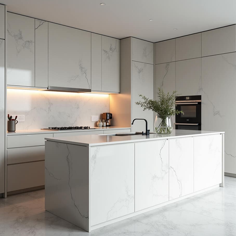 Porcelain slab kitchen — where the same material is used for the countertop, backsplash, and even the wall, creating a seamless, cohesive look with minimal joints and maximum style.