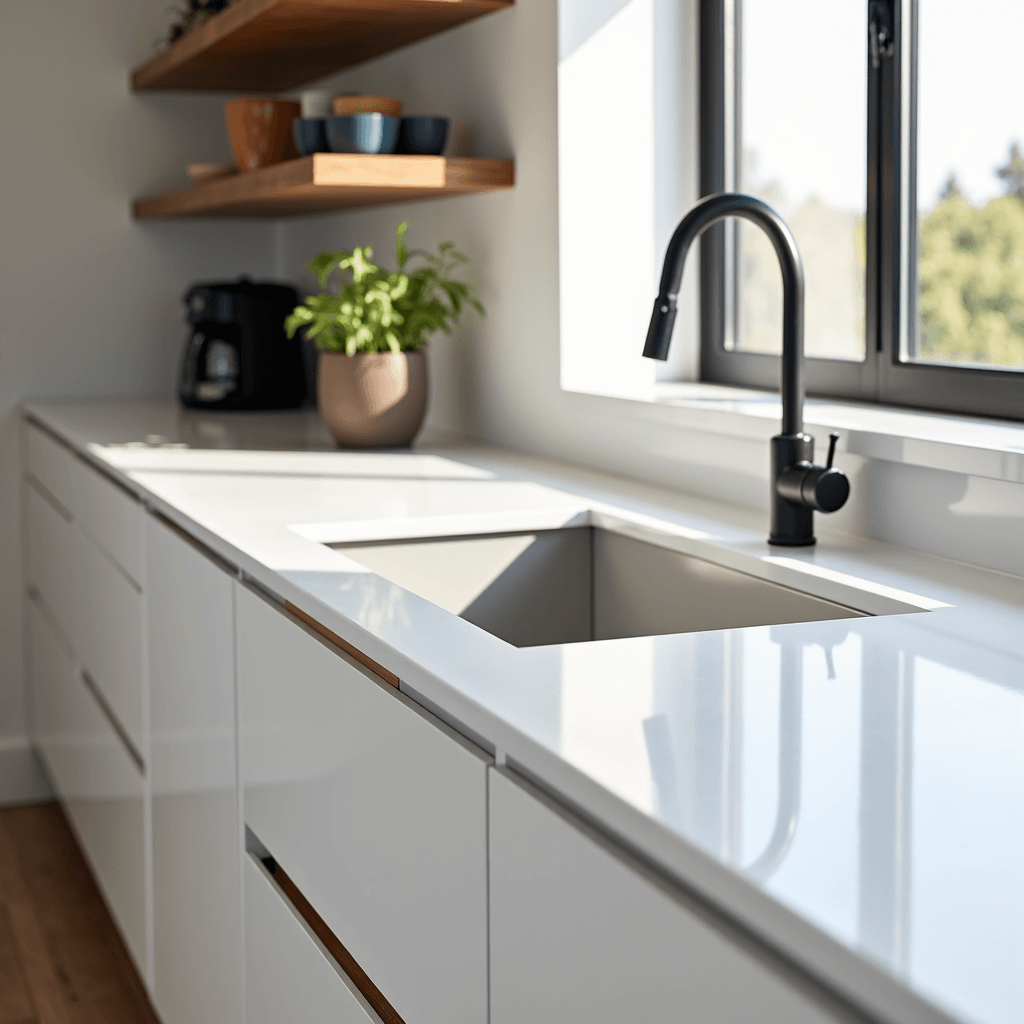 Quartz — practical and durable, but sensitive to sunlight. Place it under a window, and the color will fade after a year. Yes, it’s convenient, but it requires enclosed spaces and careful installation.
