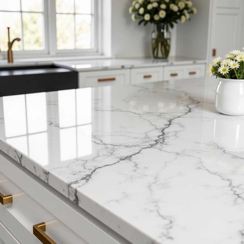 Porcelain marble slabs with Calacatta or Carrara vein imitation — visually resembling real marble, but without the maintenance, worry of spilling wine, or the need for sealing