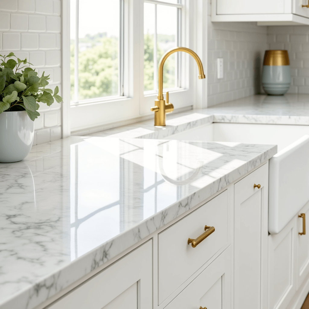 A glossy white countertop with subtle light gray veining — the perfect match for a classic kitchen with gold accents.