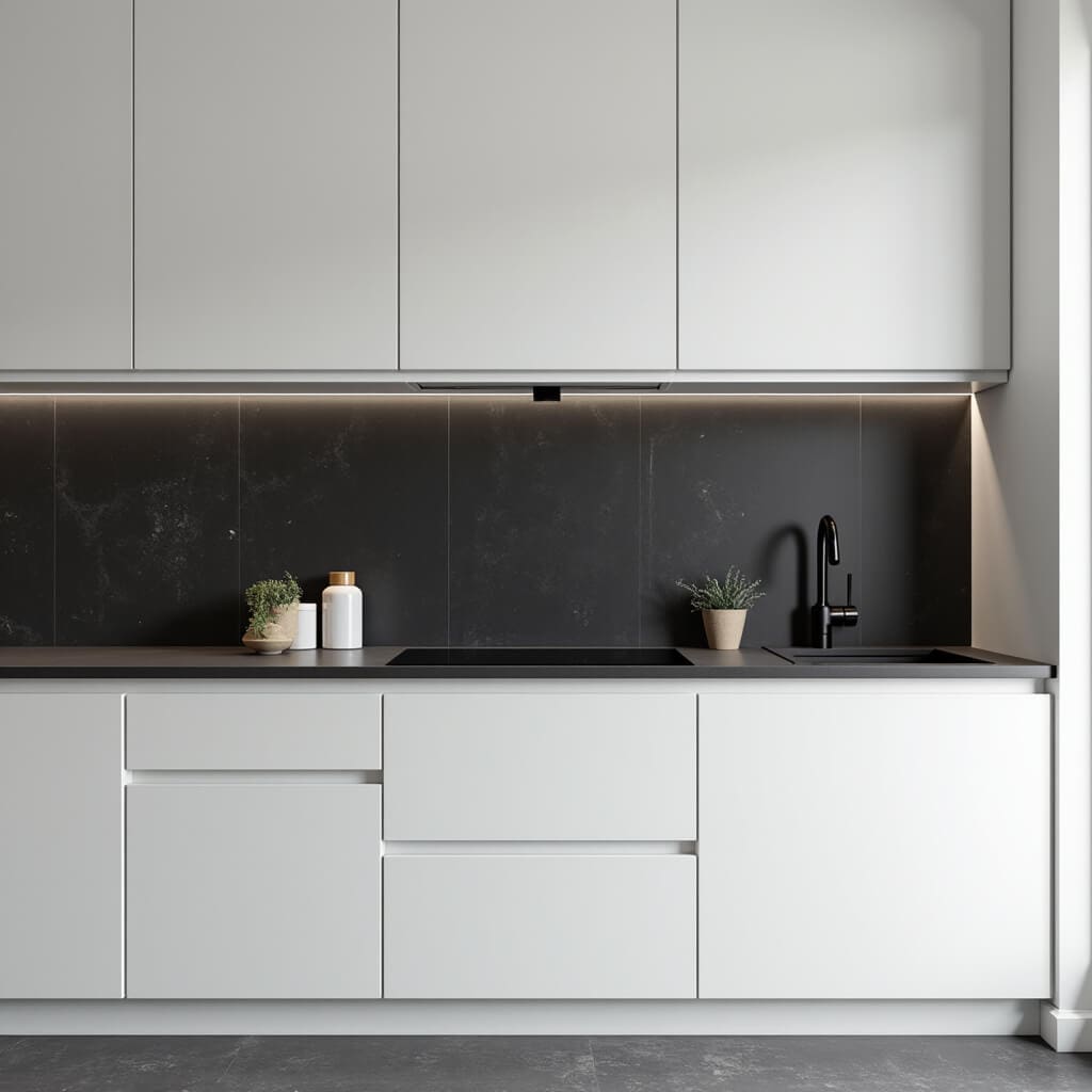 A dark porcelain tile countertop against white cabinetry — minimalism with character.