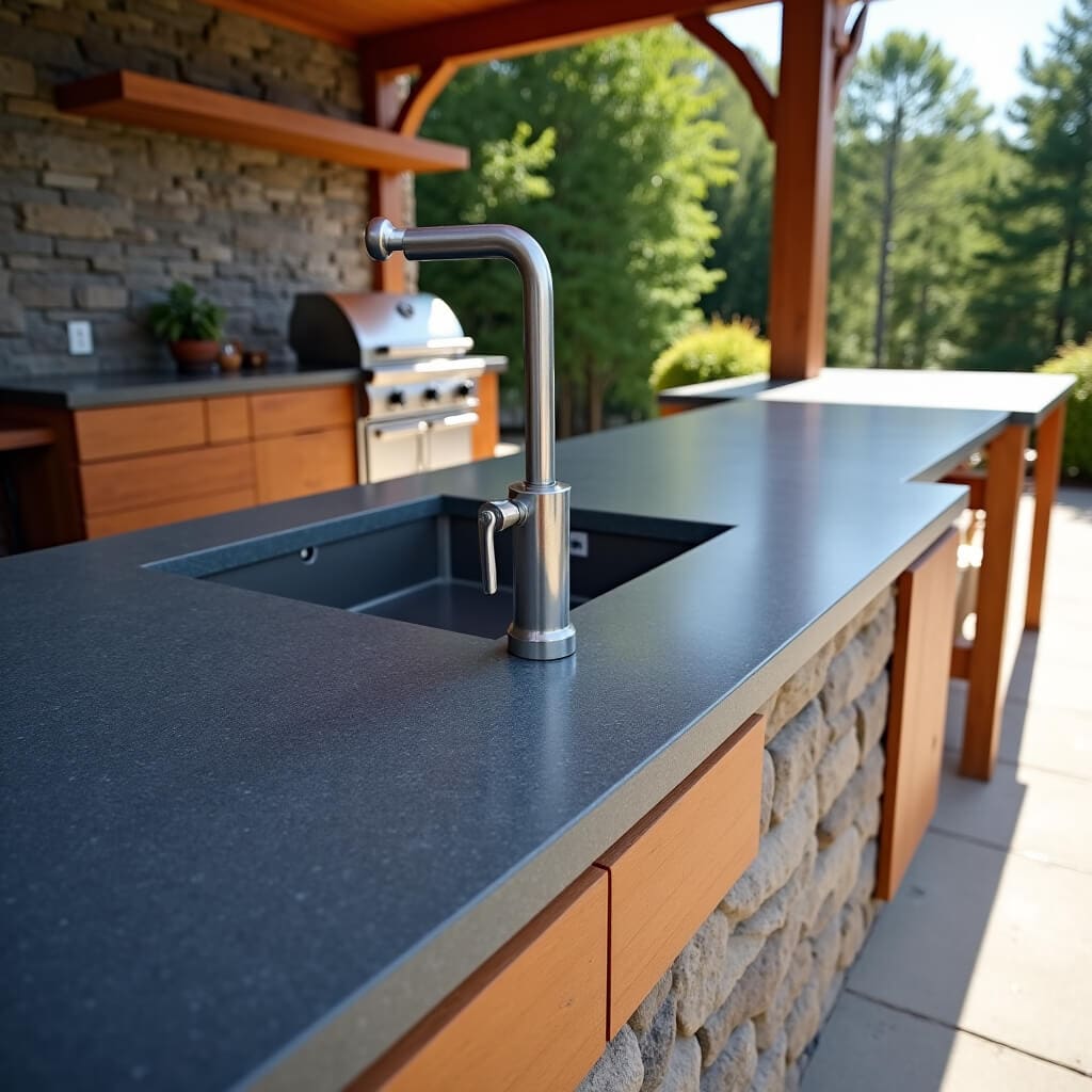 A matte slate-look texture in an outdoor kitchen — stylish and resistant to both rain and sun.