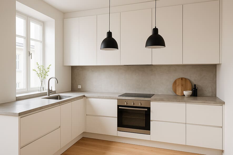 Absolutely. The contrast between gray or charcoal concrete and white cabinetry looks fresh and modern. Add black hardware or wood accents, and you’ll have a balanced, stylish kitchen without making it look too stark.