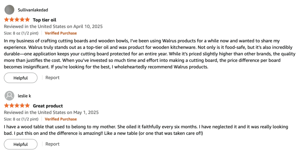 Walrus Oil Butcher Block Oil — a thicker, richer blend with natural oils and vitamin E that gives the wood a warm tone.