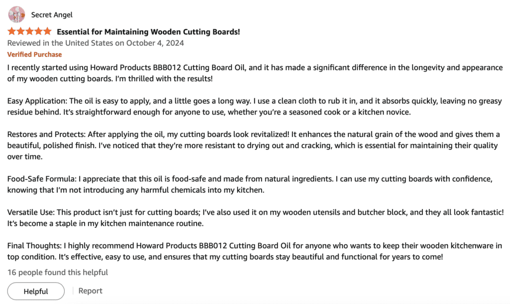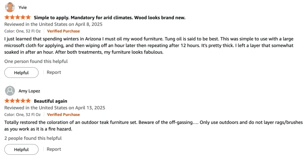 Downside: This oil takes longer to dry (sometimes up to 24 hours between coats) and requires careful application. If you apply too much or too thickly, the surface may feel sticky or develop blotchy spots. So it’s important to apply thin, even layers and ventilate the room well.