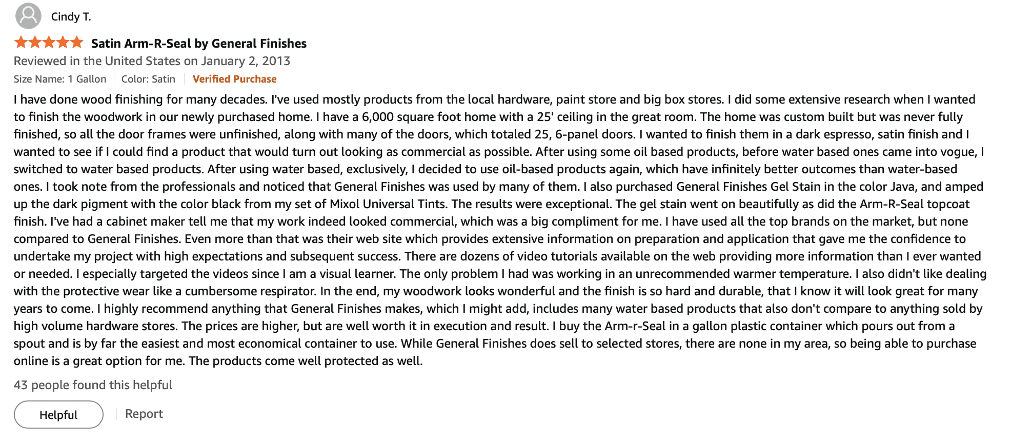 General Finishes Arm-R-Seal — semi-gloss, smooth sheen, easy to apply with a sponge.