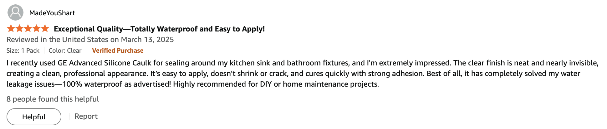 GE Advanced Silicone Kitchen & Bath Sealant — one of the most popular options. Mold-resistant, non-yellowing, fast-drying.