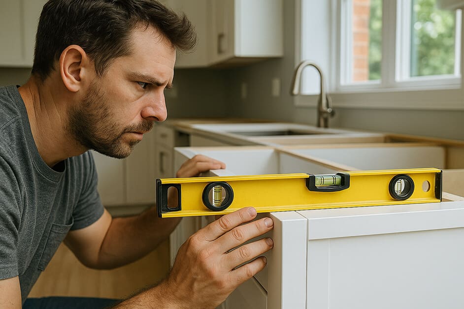 Make sure all your cabinets are level and securely fastened. Even a small tilt can cause the countertop to sit unevenly or shift over time. Use a level to check the surface along its entire length. It’s better to spend a few extra minutes adjusting now than to fix problems later.