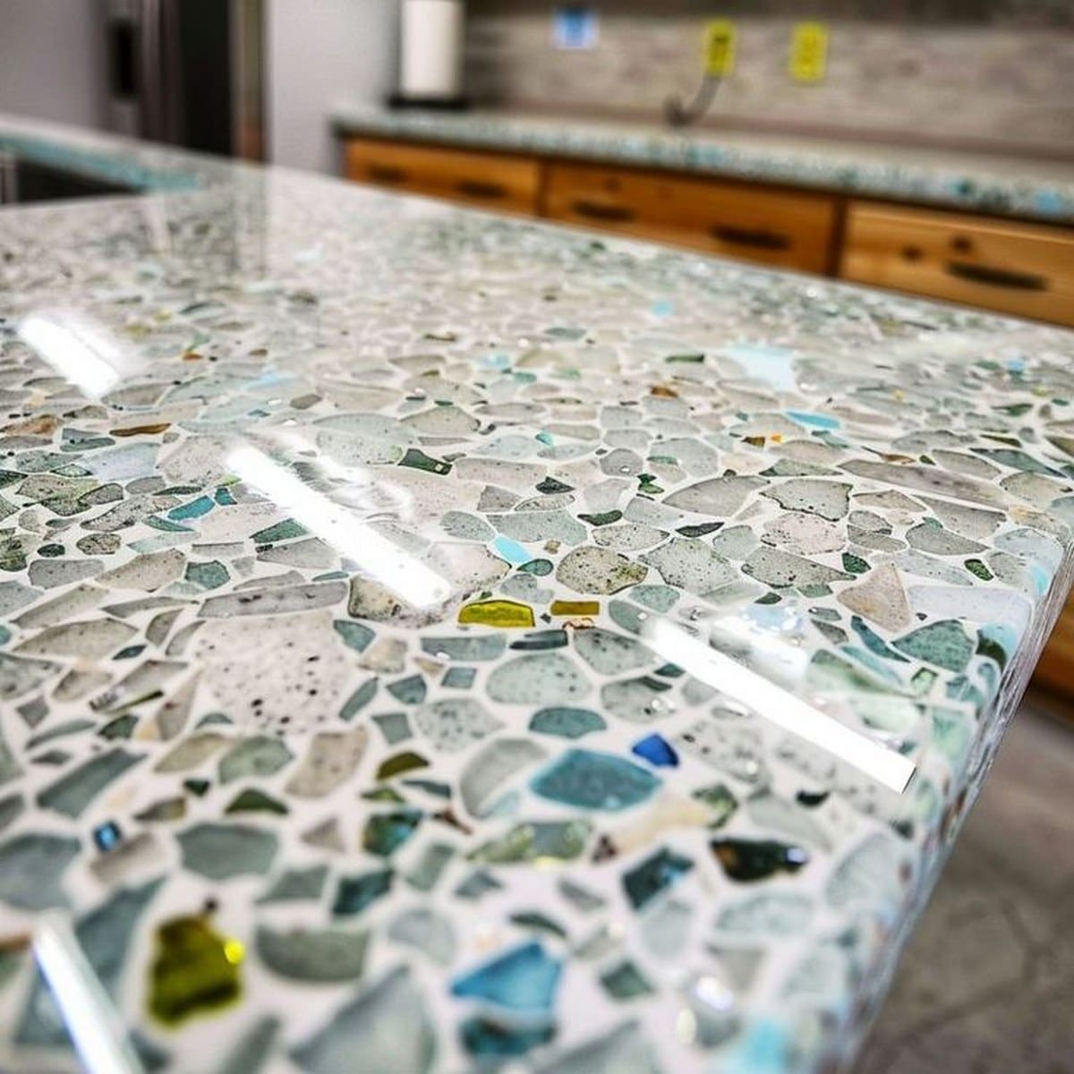 Designers are particularly drawn to the ability to integrate glass composites into warm, neutral, or eco-oriented palettes — from beige-sand tones to deep greens and gray-blues. Visually, these surfaces resemble modern terrazzo, but with a genuine recycling story behind them.