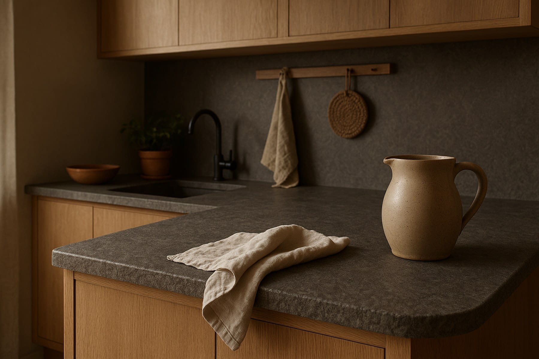 Modern technologies allow manufacturers to precisely control the composition and color palette of these countertops, achieving strong decorative expression and high resistance to mechanical and thermal stress. The materials require minimal maintenance, do not need sealing, and are suitable for active use in kitchen environments.