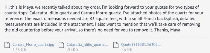 - Then sent the same email to all contractors requesting an estimate for our countertop with a clear description and photo of the project and even names and photos of materials: